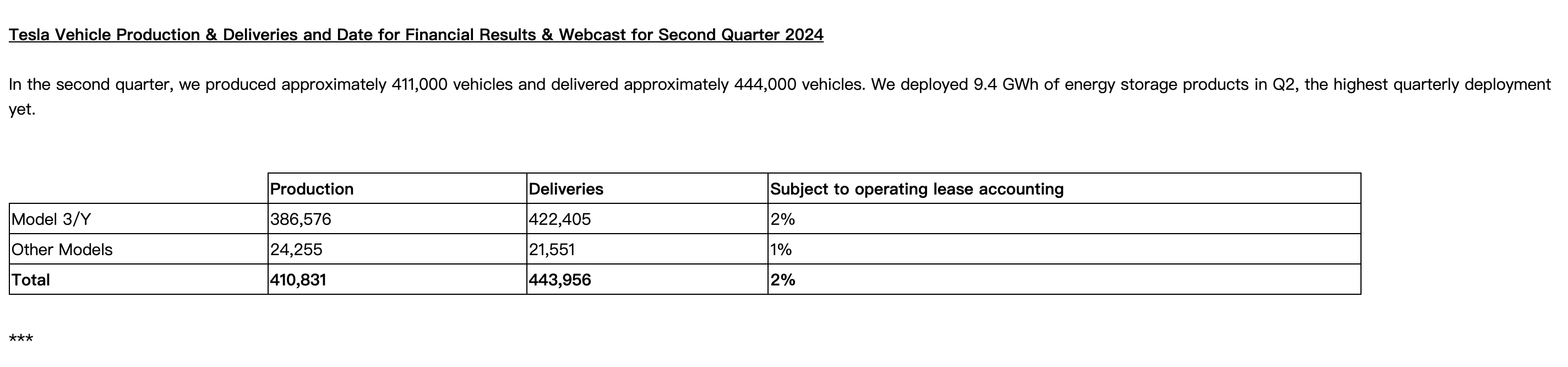 消息面上,7月2日,特斯拉公布的交付数据显示,公司Q2共交付新车44.40万辆,同比下降4.8%,连续两个季度出现同比下滑,但好于市场预期的43.93万辆,Q2总产量约41.1万辆。