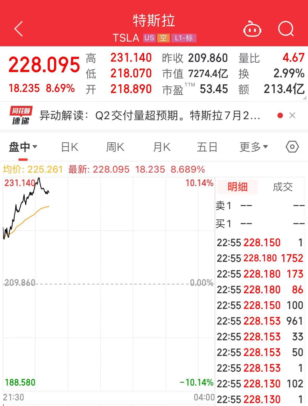 北京时间7月2日晚,美股三大指数集体低开,然而,特斯拉盘中涨幅一度扩大至10%,股价最高达231.15美元,在二季度车辆交付数据发布后,创1月份以来新高。总市值重回7200亿美元之上。